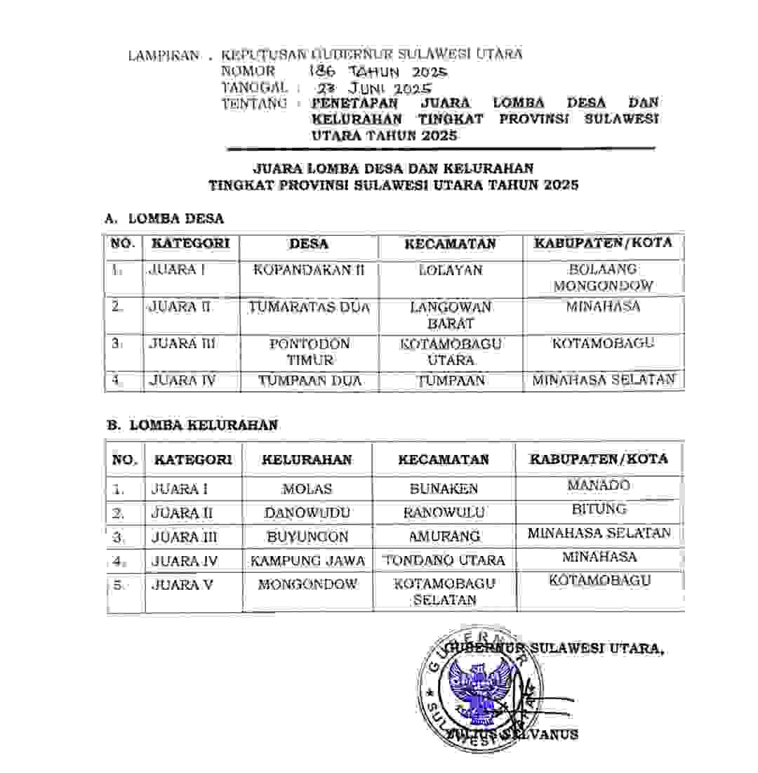 Diketahui, desa ini dinobatkan sebagai juara dua. Keputusan ini diumumkan setelah melalui proses penilaian lapangan yang dilakukan oleh tim dari Dinas Pemberdayaan Masyarakat dan Desa (PMD) Provinsi Sulut, berdasarkan Surat Keputusan Gubernur Sulut Nomor 186 Tahun 2025.