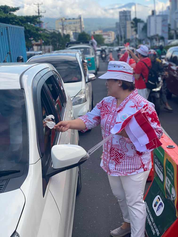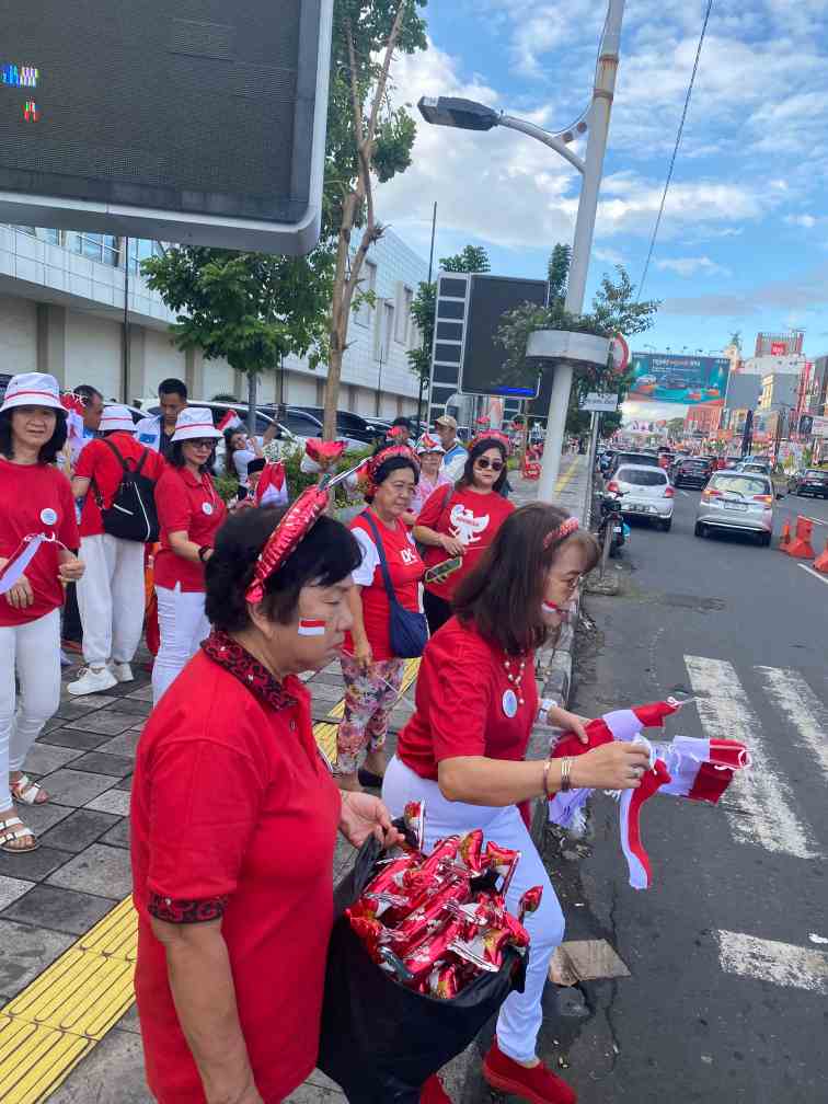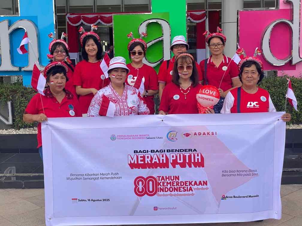 Seratus bendera, dan merchandise dibagikan langsung kepada masyarakat oleh Persaudaraan Wanita Tionghoa Indonesia (Perwanti) Sulawesi Utara bersama sejumlah komunitas.