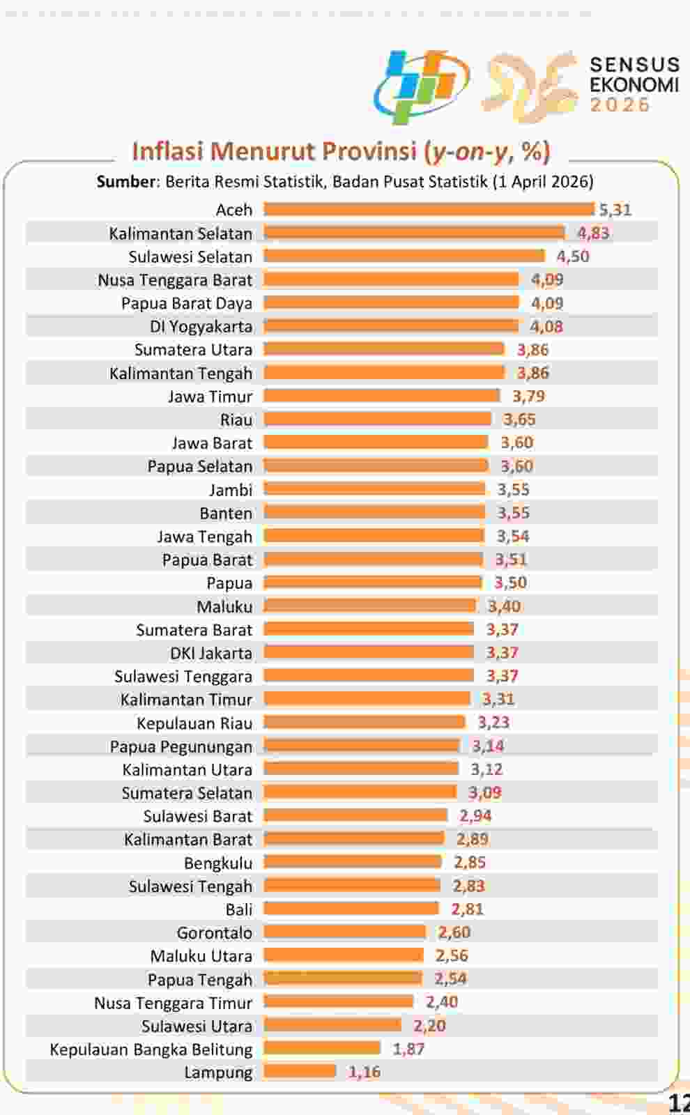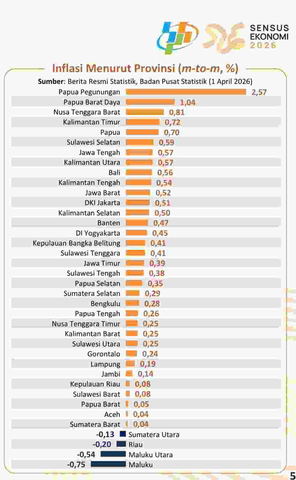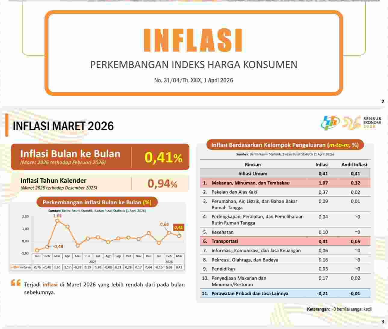 Selain itu, kebijakan pemerintah pusat melalui Paket Stimulus Ekonomi 1-2026 juga memberi pengaruh terhadap stabilitas harga. Insentif di sektor transportasi mendorong terjadinya penurunan harga pada sejumlah layanan, seperti tarif jalan tol, angkutan laut, ASDP, dan kereta api, yang turut membantu menjaga daya beli masyarakat.